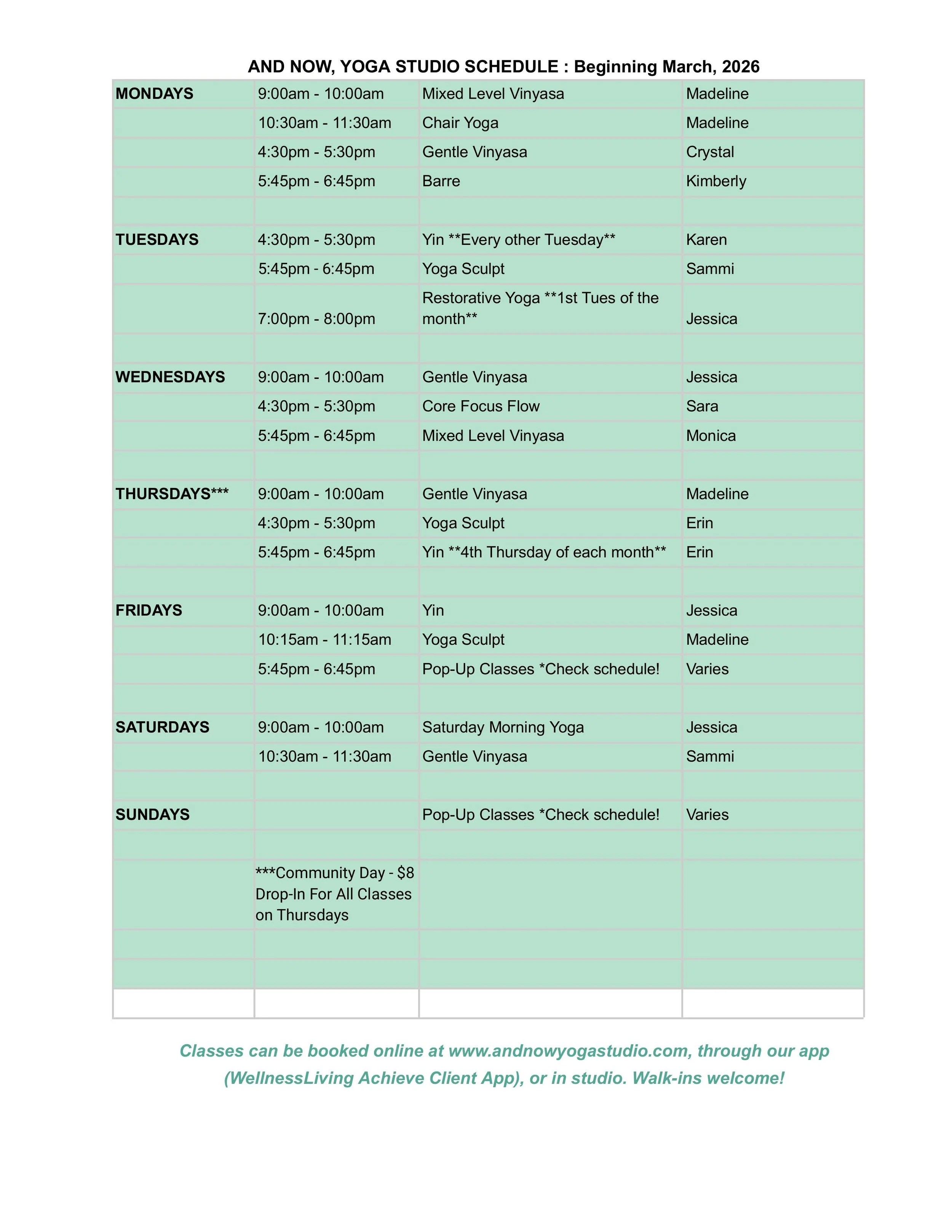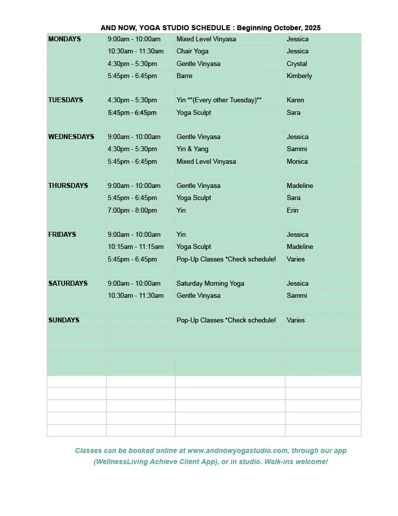 ***Classes can be booked online at www.andnowyogastudio.com, through our app (WellnessLiving Achieve Client App), or in studio. Walk-ins welcome!